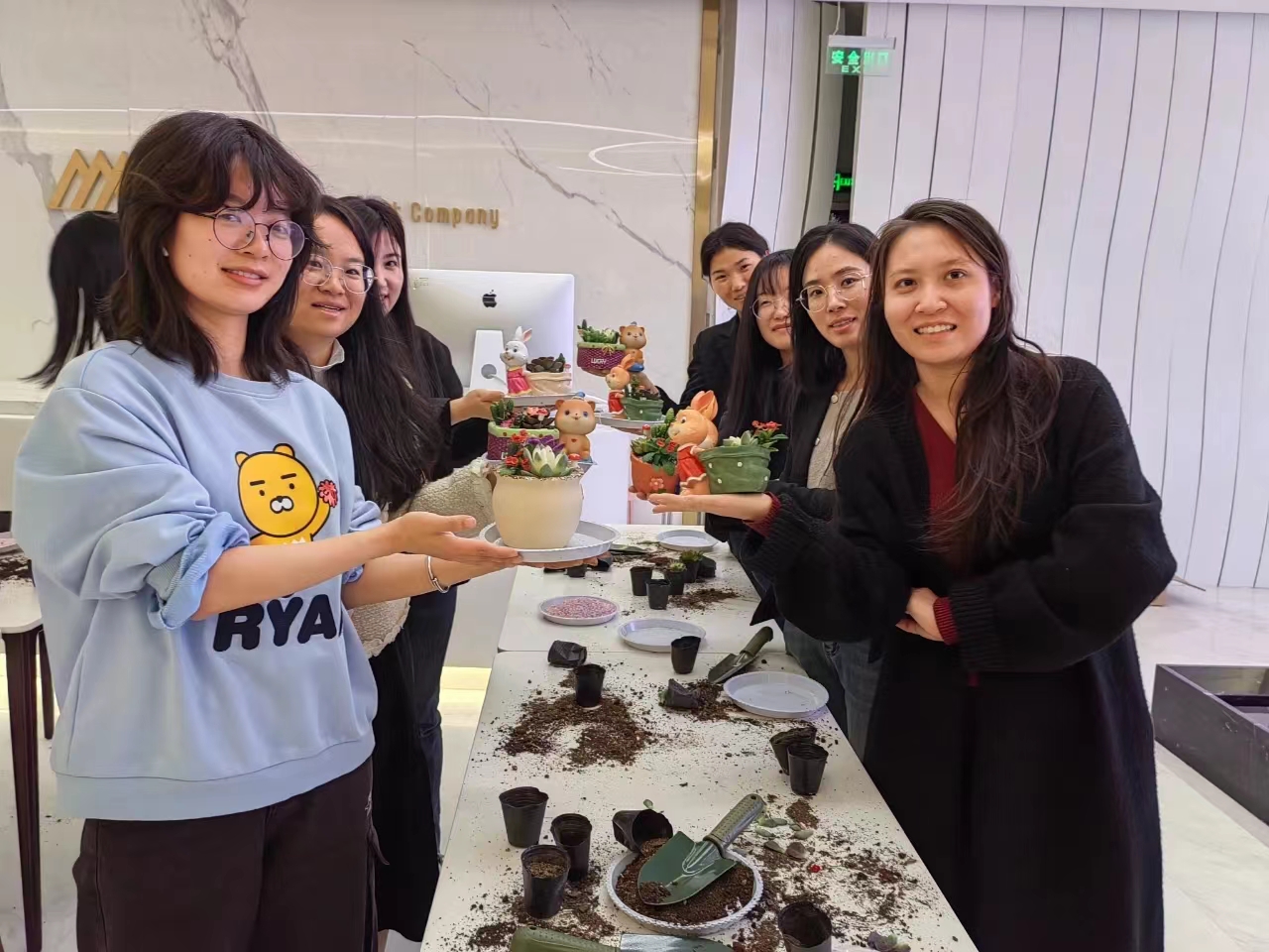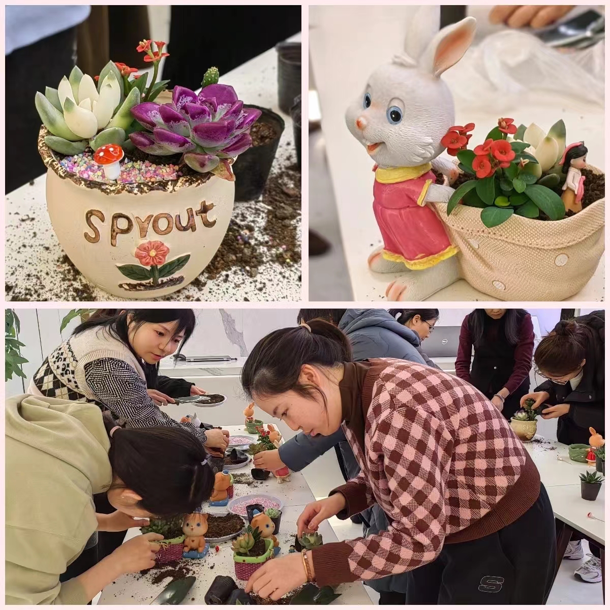 在DIY環(huán)節(jié),大家變身巧手花匠,盡情釋放自己的想象力,打造各具特色的純手工盆景。大家手拿小鏟子,將不同種類的多肉植物錯(cuò)落有致地搭配在一起,填土、配色、種植、鋪面……精致可愛(ài)的作品慢慢展現(xiàn)在大家面前,每個(gè)人臉上都洋溢起笑容,紛紛開(kāi)心留影。