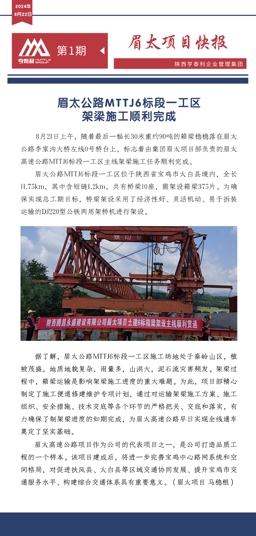 眉太公路MTTJ6標段一工區(qū)架梁施工順利完成