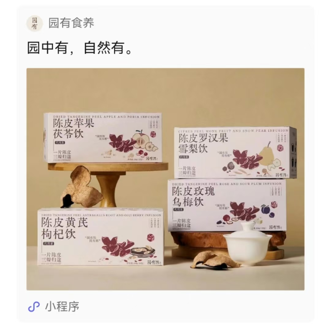 “園有”養(yǎng)生茶在銷售渠道布局上,采用了線上線下融合的多元化策略。在線上,通過(guò)自主開(kāi)發(fā)的小程序、微信公眾號(hào)、小紅書(shū)等社交媒體平臺(tái)進(jìn)行營(yíng)銷推廣,提高品牌的知名度和影響力。在線下,“園有”入駐集團(tuán)陳皮養(yǎng)生館,讓消費(fèi)者能夠在日常生活中方便地購(gòu)買到。自產(chǎn)品上市,短短兩周時(shí)間已售賣4000余盒。 養(yǎng)生茶飲如何成為情感載體