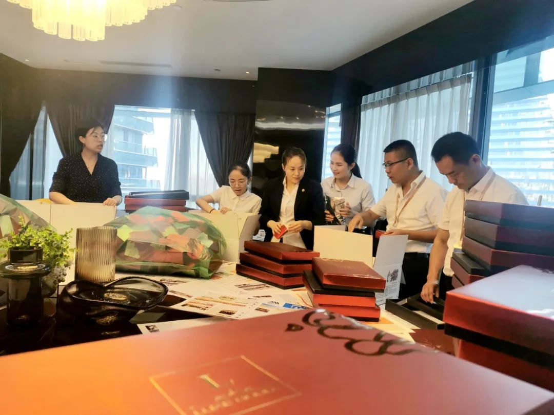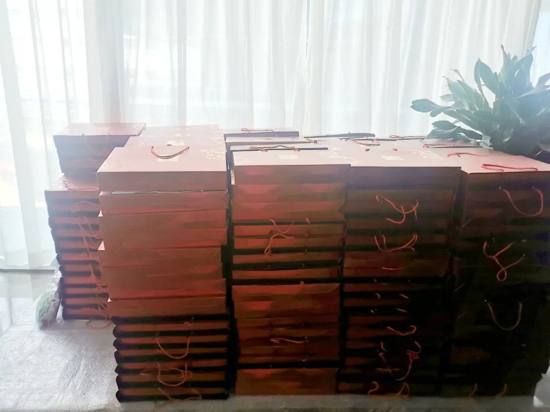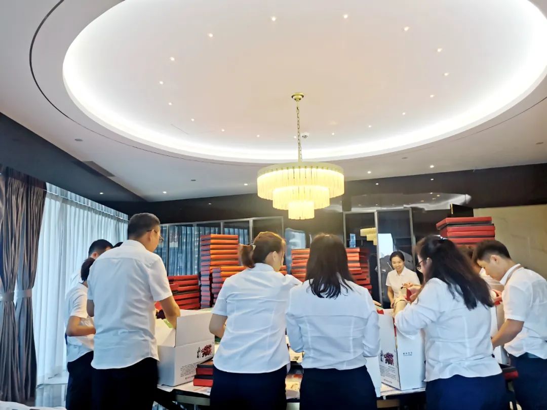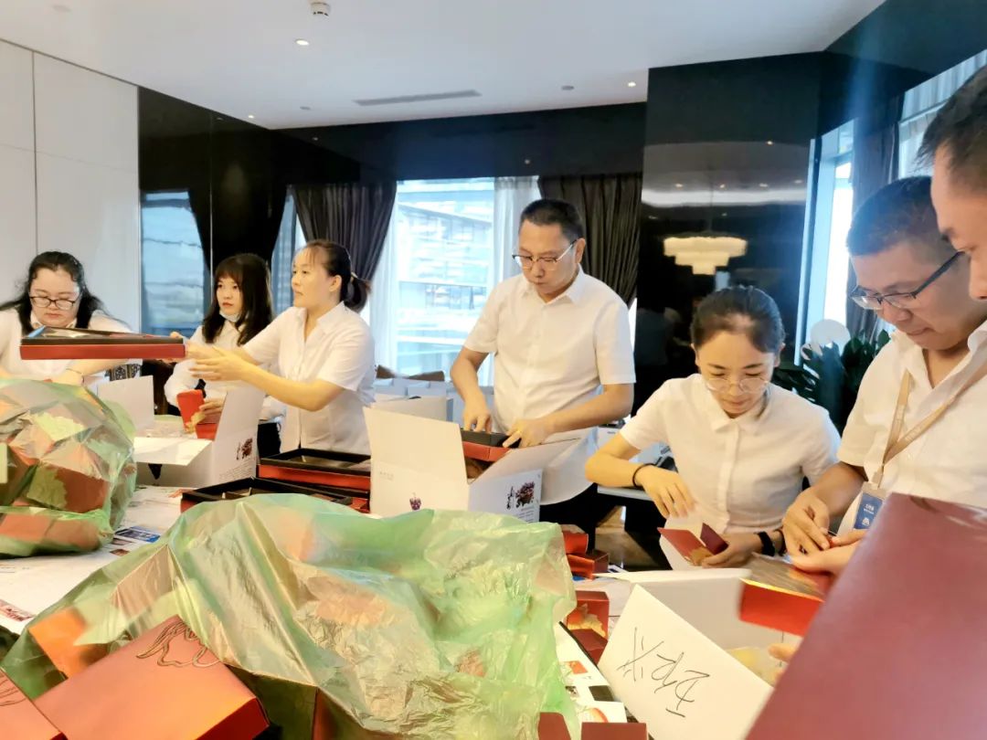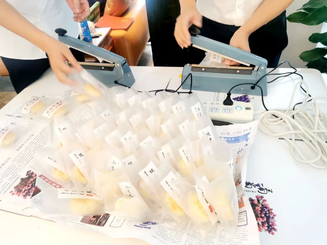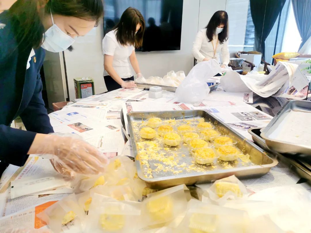打開禮盒的盒蓋,禮盒內(nèi)部錯落有致擺放了八枚小紙盒,每一枚月餅賦予美好中秋祝愿,甜上心頭,情意悠悠。也寓意著,在全體亨泰利人的共同努力下,集團的事業(yè)必將蓬勃發(fā)展、興旺發(fā)達,集團成員隊伍也將不斷擴大。 集團宴會廳的月餅包裝現(xiàn)場,烤盤里一枚枚金黃飽滿、皮薄餡靚的月餅,滿室飄香。小伙伴們分工明確,嚴格按照食品安全流程,裝袋、塑封、裝箱,形成一道亮麗的“流水線”,從青澀到熟練,大伙們用心包裝著每一塊月餅,通力協(xié)作、配合默契,忙得不亦樂乎。在歡聲笑語中,很快第一個環(huán)節(jié)——月餅裝袋、塑封就完成了。